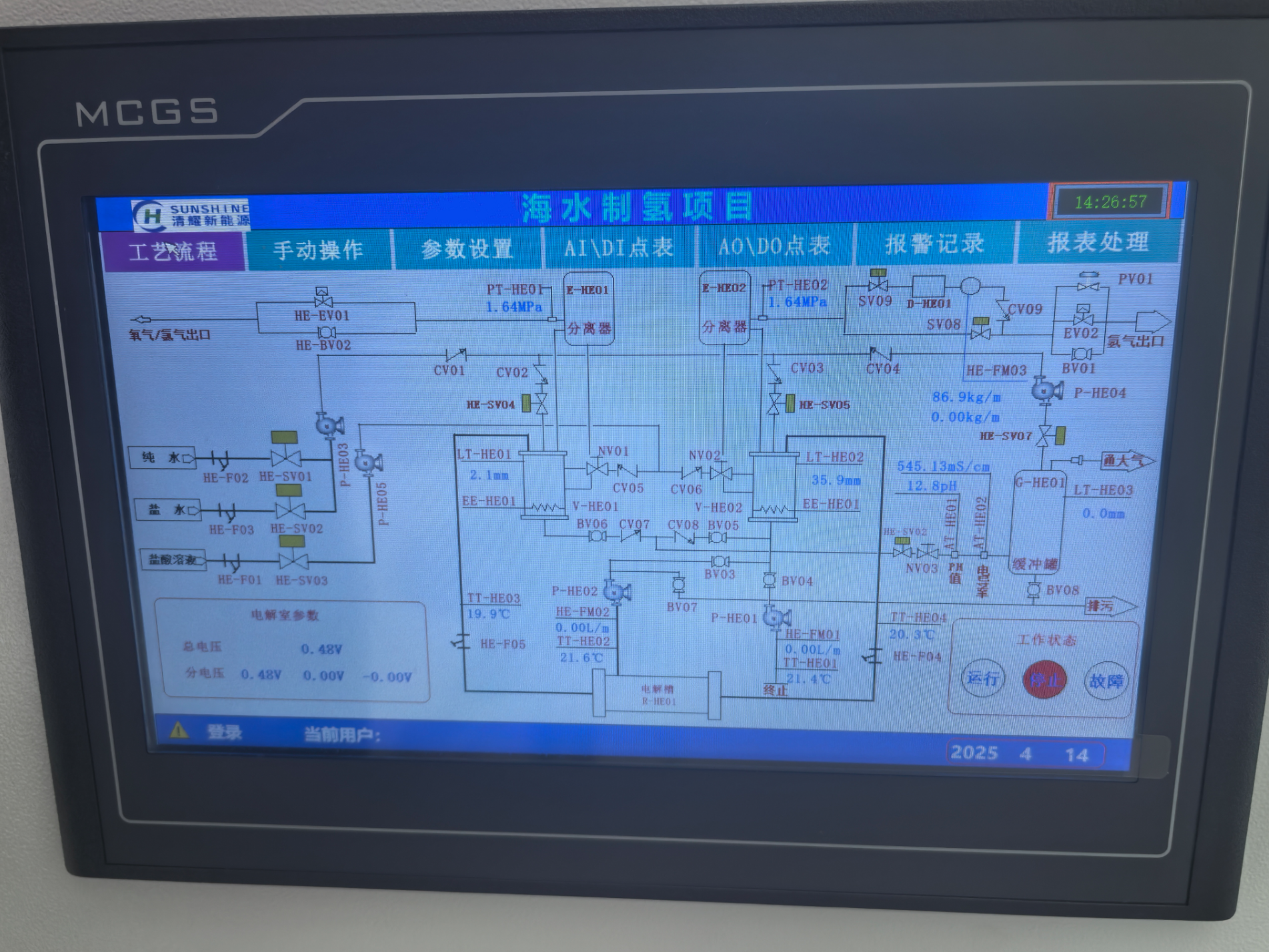 该设备能够对系统循环液的电导率与PH值进行实时监测,并根据实时数据自动完成补酸补盐过程,维持系统离子浓度平衡,确保真实模拟海水电解工况,保证电解反应始终处于最优状态。系统最高工作压力可达1.6Mpa,通过高精度电动调节阀实现压力稳定与液位控制,保障实验过程安全可靠。