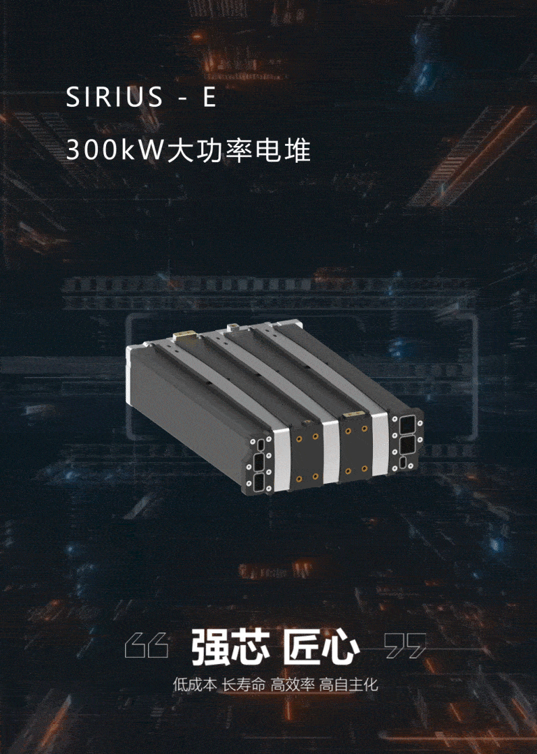 SIRIUS-E 大功率燃料电池电堆模组在前两代产品的技术开发和工程应用经验的基础上,针对轻、中、重型交通领域动力需求及航运船舶、储能发电、工程机械等多元场景的应用需求进行了全新的开发,产品拥有150-300kW功率等级、95℃耐高温运行以及30,000小时电堆寿命等特点,并实现了50%的降本。SIRIUS-E继续秉承了优异的设计可制造性,迭代扩展高柔性和应用场景多样性,由韵量新能源自主开发的超薄复合石墨板通过耐高温、高Tg树脂和石墨材料的复合成型使得石墨双极板总厚度薄至1.37mm, 最薄处进一步下探到业内最新应用极限的0.25mm;自主开发的高性能膜电极采用了集成单池密封的6合1膜电极设计并首次批量化使用国产质子交换膜。
