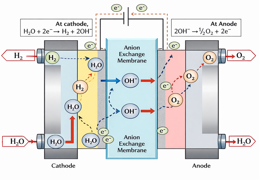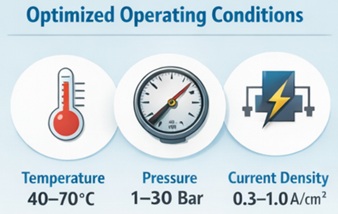 电流密度是另一关键运行参数。现行AEM电解槽通常在 0.3-1.0 Acm² 范围内运行。更高电流密度可提升单位堆面积的产氢量,但同时会增加电压损耗和材料应力。当前研究致力于在不缩短系统寿命的前提下提高电流密度。