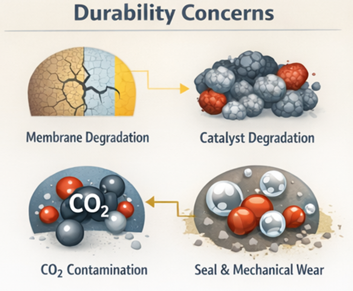 系统层面的机械与运行问题同样影响使用寿命,密封件和垫片会随时间劣化,堆栈内不均匀的压缩力可能损伤膜和电极,运行中的热循环会引入额外应力。