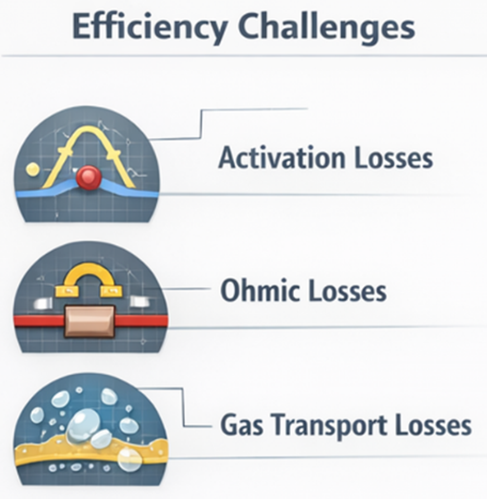 随着电流密度提升,所有损耗均趋于显著,离子穿膜难度增大,高电流密度下气泡更易聚集,这将推高电压并限制大功率运行。